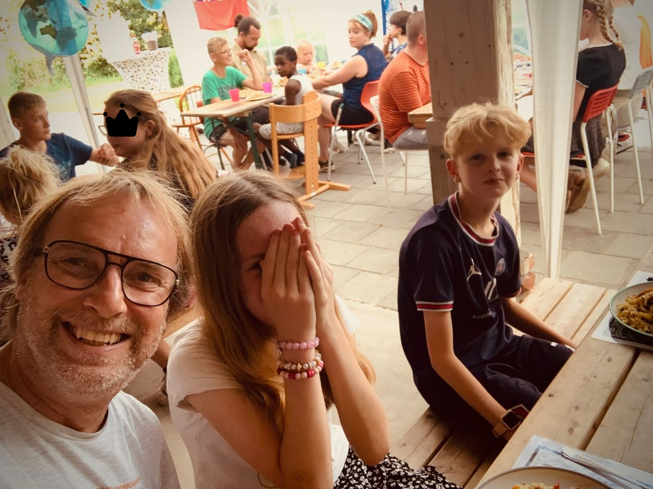 Ondertussen checken de kinderen in. De reis om de wereld kan beginnen.